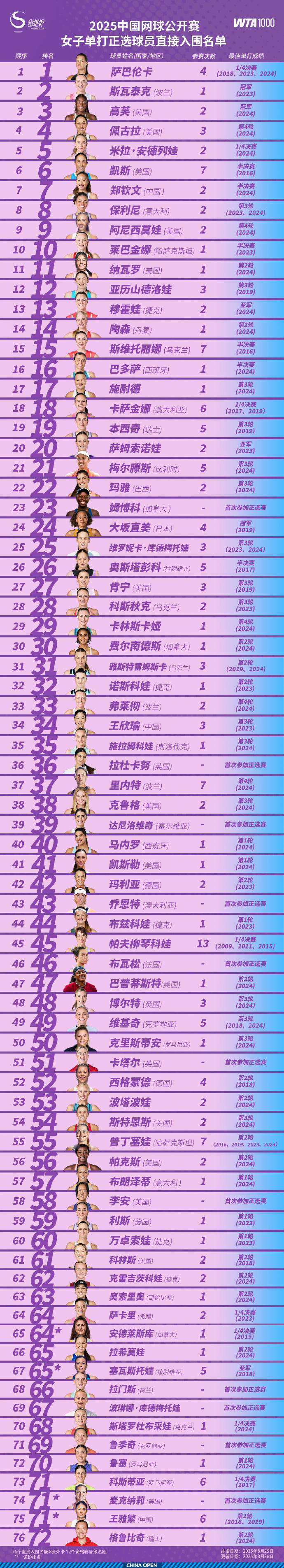 @中网ChinaOpen今日公布2025中网参赛名单,WTA方面群星荟萃,全明星阵容出战!中国金花主场作战;萨巴伦卡、斯瓦泰克、高芙“三巨头”领衔女子天团;还有安德列娃携新生代球员惊艳亮相,展现女子网坛新生力量!